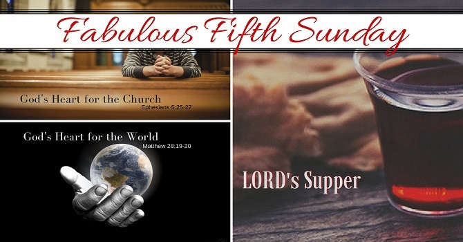 Every month with a fifth Sunday we celebrate the Lord's Supper in remembrance of the sacrifice of Jesus Christ in obedience to scripture.